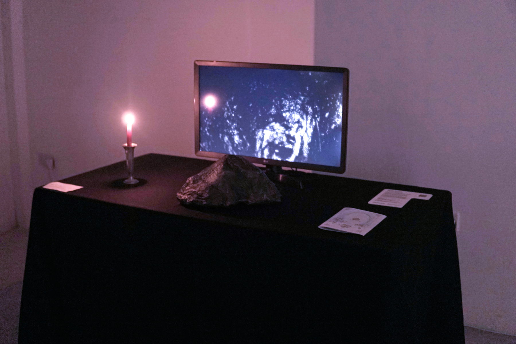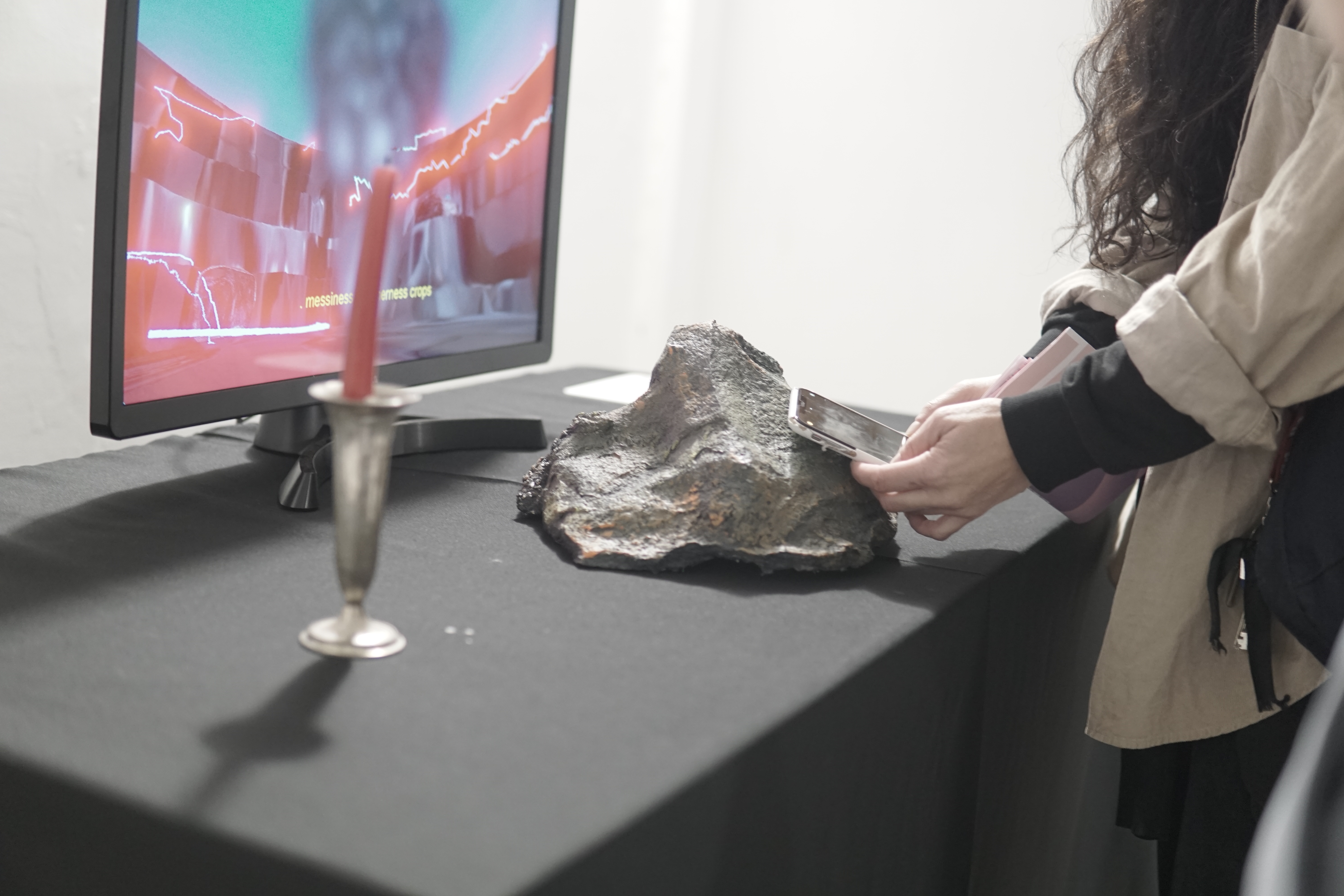 Egolith Xenolith is a geomantic installation that amplifies our kinship with mineral matter using the methodology of speculative fiction. In an attempt to create an interface that enables the communication between humans and stones, the electromagnetic fields from the public’s cellphones are translated into the English language to amplify the storie of extractivism, dispossession, and socioecological degradation inherent within the production of digital technologies.